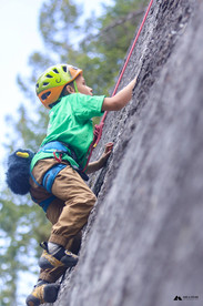 La primera ruta que elegimos fue una 5.6, ideal para que los niños se familiaricen con la roca y calienten los músculos. Subió primero mi buen amigo Shawn, quien me acompaña en muchas de estas aventuras. Shawn tiene una gran habilidad para montar rutas con seguridad y siempre logra que los chicos se sientan tranquilos desde el primer momento. Instaló las anclas en la cima y dejó todo listo para que los aventureros empezaran su ascenso.